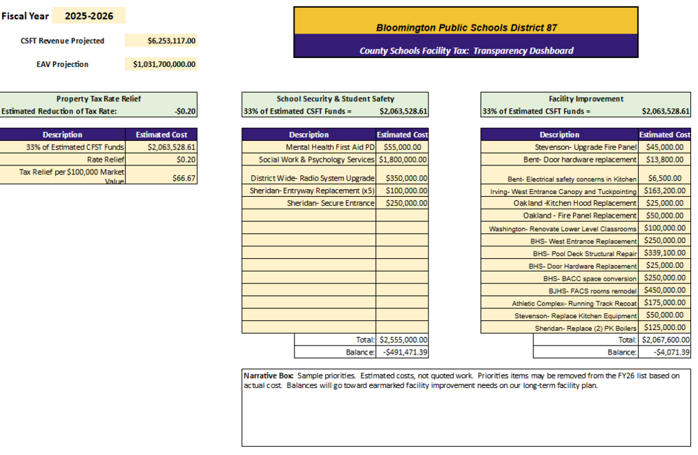 The image represents the District 87 County Schools Facility Tax (CSFT) Transparency Dashboard. If the CSFT were to pass, it would be our intention to update this document throug...